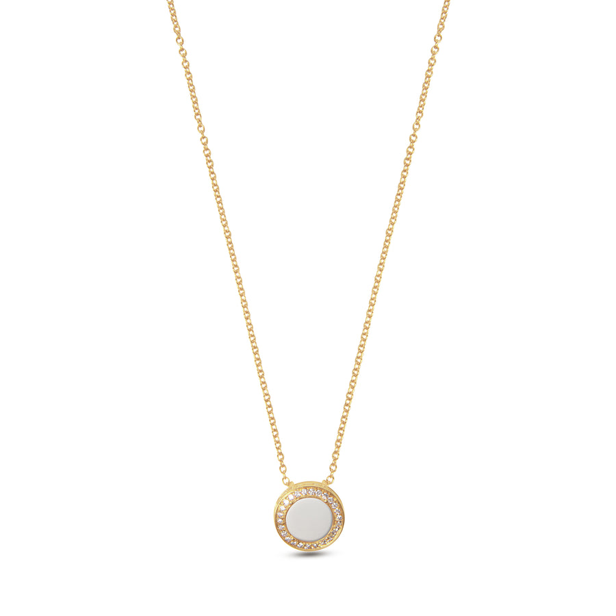 The name Eternity symbolizing the essence of timeless beauty and endless elegance, each necklace is crafted to represent concepts that endure forever.  The perfect round shapes in this collection symbolize the eternal cycle of life and love. The Eternity necklace is set with natural diamonds and hand selected gemstones chosen for their spiritual beliefs